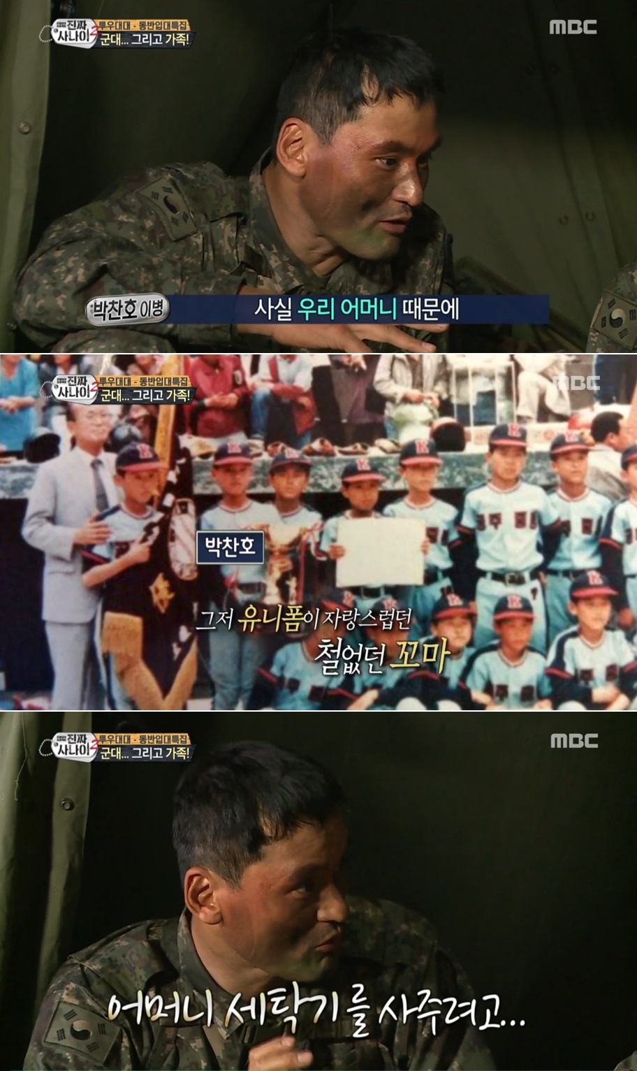 박찬호는 “아침엔 항상 유니폼이 깨끗했다. 어느 날 잠결에 어머니가 흙 묻은 유니폼을 하염없이 빠는 모습을 봤다. 그때 누워서 ‘야구로 성공해야겠다’고 생각했다”고 말했다. 이어 “왜냐하면 어머니 세탁기를 사주고 싶었다”고 이유를 설명했고, 박찬호를 코리안 특급으로 만들어준 어머니의 사랑은 가슴 찡한 감동을 전했다.
