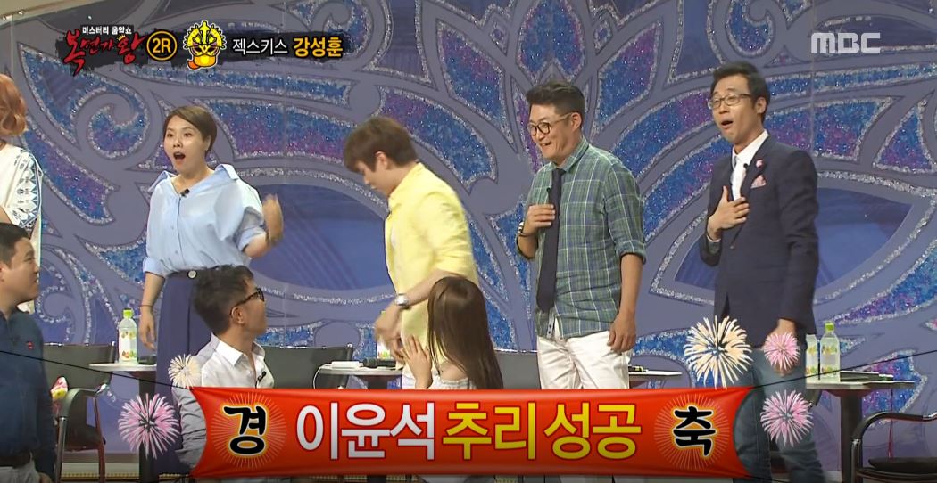 이윤석은 예상이 적중하자 크게 기뻐했다. 김성주는 “드디어 이윤석이 해냈다”라며 1년 반 만에 이룬 그의 쾌거에 감탄했다. 신봉선은 “강성훈의 방부제 외모를 보니, 강남이 더 아저씨 같다”라고 말해 웃음을 안겼다.