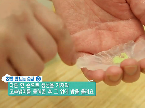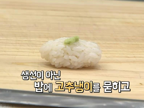 다른 한 손으로 생선을 가져와서 고추냉이를 묻혀준 후 그 위에 둥글게 만든