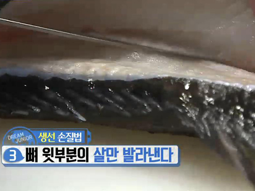 다음 등과 배사이를 살짝 자른 후 뼈 윗부분의 살만 발라낸 후 살에 박혀 있는 뼈를