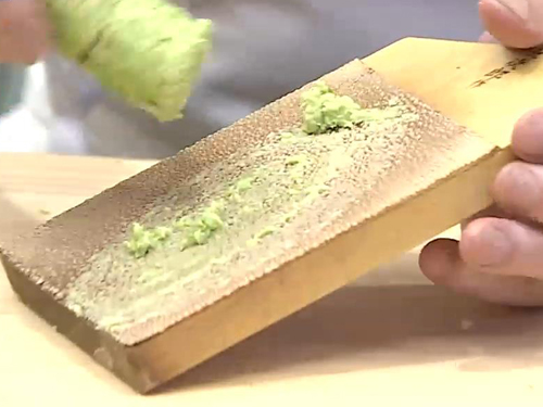 강판에 천천히 갈아야 고추냉이 특유의 단맛과 매운맛을 고루 갖출 수 있다,