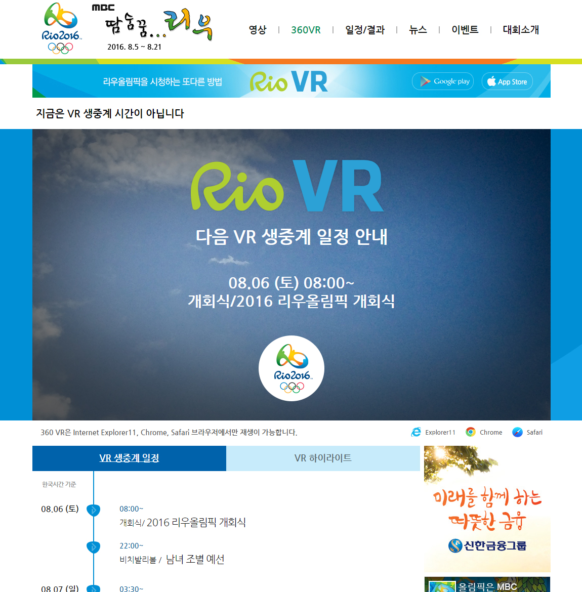 MBC <2016 리우 올림픽> 홈페이지에서는 한국시간으로 8월 6일(토) 아침 8시에 진행되는 <2016 리우 올림픽> 개회식부터 올림픽 기간 중 열리는 주요 경기 일부를 VR로 촬영해 시청자들에게 제공한다.