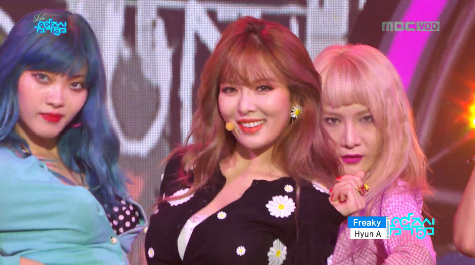 현아는 이날 '꼬리쳐'와 '어때?' 두 곡을 연달아 불렀고, 파격적인 의상과 스타일, 저돌적인 노랫말로 시청자들을 대놓고 유혹했다.