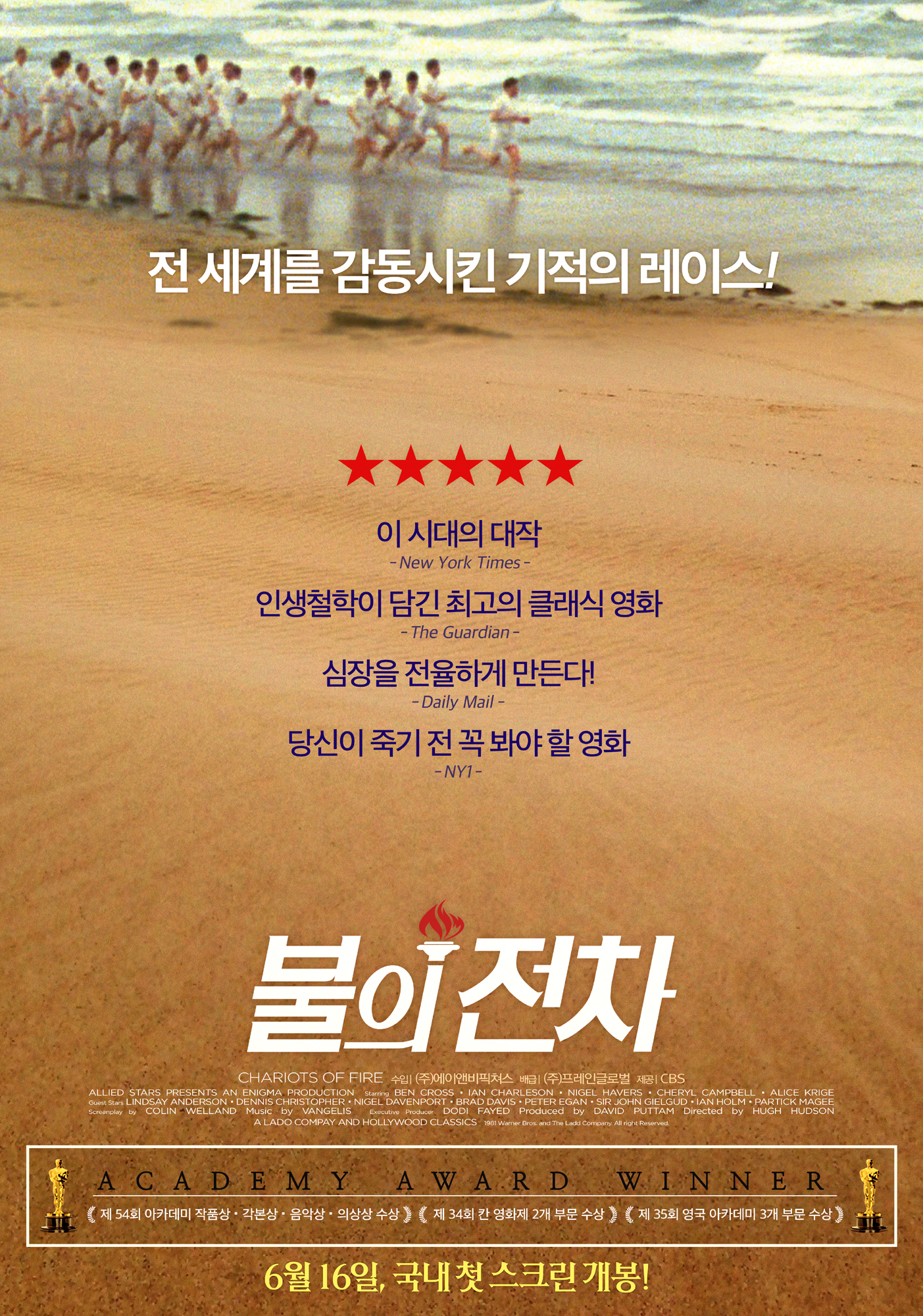 관람포인트 : 1924년 파리올림픽을 배경으로 한 영국 육상 금메달리스트인 에릭 리델과 해럴드 에이브러험의 실화를 바탕으로 한 작품. 신시사이저의 테마 음악이 유명하다. 1981년 제54회 아카데미시상식에서 작품, 각본, 음악, 의상의 4개 부문에서 오스카를 수상한 작품으로 명작 중의 명작으로 손꼽힌다. 다큐멘터리영화 감독으로 유명한 감독인 휴 허드슨이 무명 배우를 캐스팅하여 사실적이고 감동적으로 그려진 작품이다.