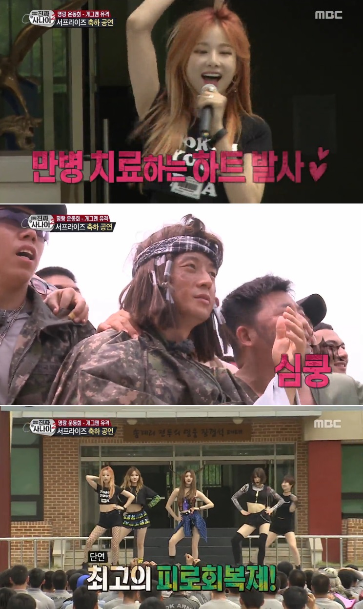 14일에 방송된 MBC 예능프로그램 <일밤-진짜 사나이>에서는 EXID가 명랑 운동회에 깜짝 등장하는 모습이 그려졌다.