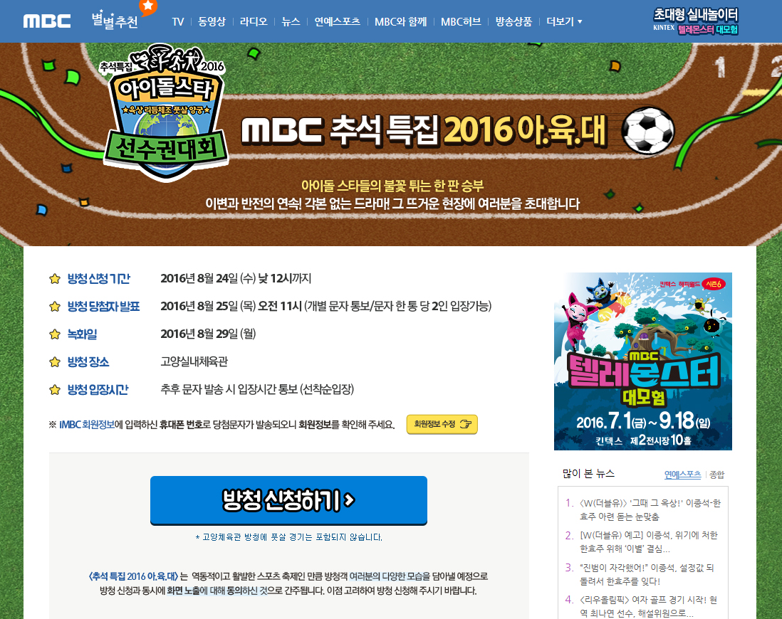 국내 최정상급 아이돌 스타들의 스포츠 축제, <추석특집 2016 아.육.대> 방청신청에 대한 자세한 사항은 iMBC 공식 홈페이지에서 확인할 수 있다.
