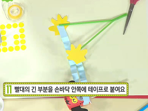 빨대 두 개를 구부려서 'Y‘ 모양으로 잡고 테이프로 감아서 고정 시켜 빨대의 긴 부분을 손바닥 안쪽에 각각 테이프로 붙인다.