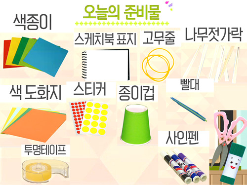 준비물은 색종이, 가위, 풀, 색 도화지, 사인펜, 종이컵, 스티커, 투명테이프, 빨대, 나무젓가락, 고무줄, 스케치북 표지가 필요하다.