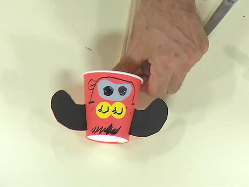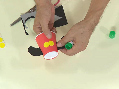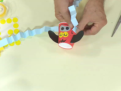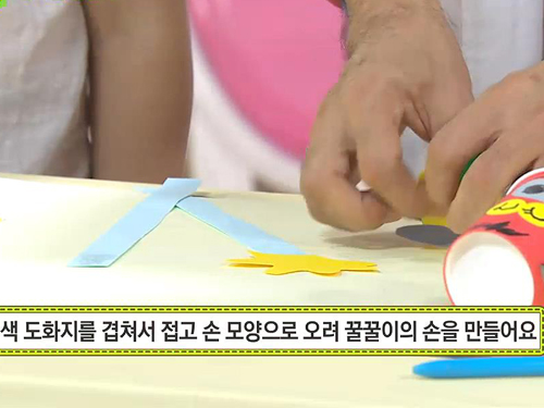 손을 붙인 색 도화지 두 개를 겹쳐 놓고 앞뒤로 번갈아 가면서 접는 병풍 접기를 하고 종이컵 양옆에 팔을 하나씩 테이프로 붙인다.