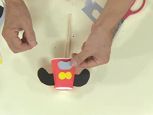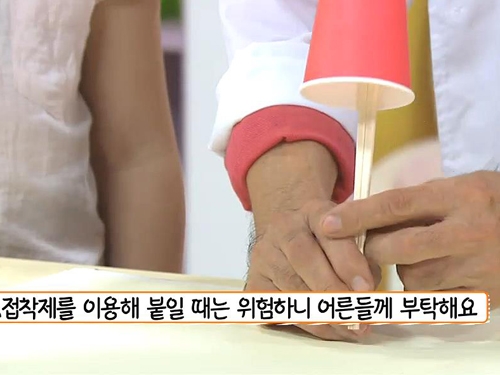 먼저 나무젓가락과 종이컵을 붙이는데 테이프나 풀은 떨어질 위험이 있으니 접착제로 안쪽을 붙인다.