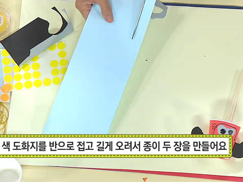 다음은 팔을 만드는데 색 도화지를 반으로 접고 길게 오려서 종이 두장을 만든다.