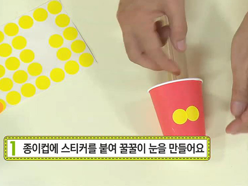 그런다음 종이컵에 스티커 2개를 나란히 붙여 꿀꿀이 눈을 만든다.