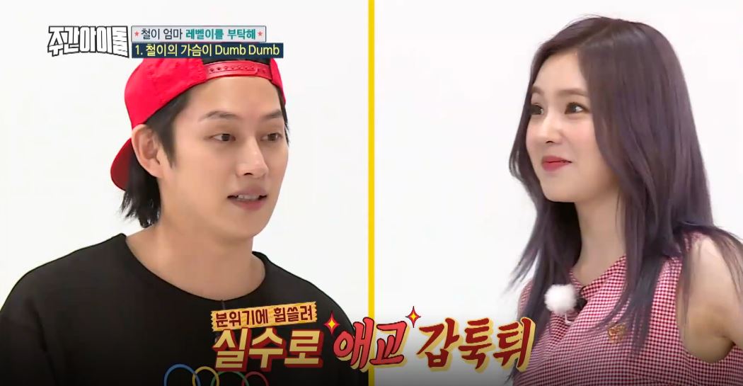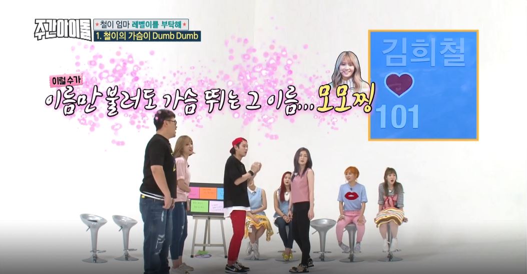 이날 레드벨벳은 ‘철이의 가슴이 Dumb Dumb’ 게임에서 김희철의 심장을 가장 덤덤하게 만들기 위해 노력했다. 아이린 차례가 되자, 김희철은 “얼굴만 봐도 심장박동수가 떨어지네요”라고 말했다. 같은 소속사 동료로서 오랜 시간 봐왔기에 설레지 않는다는 것.