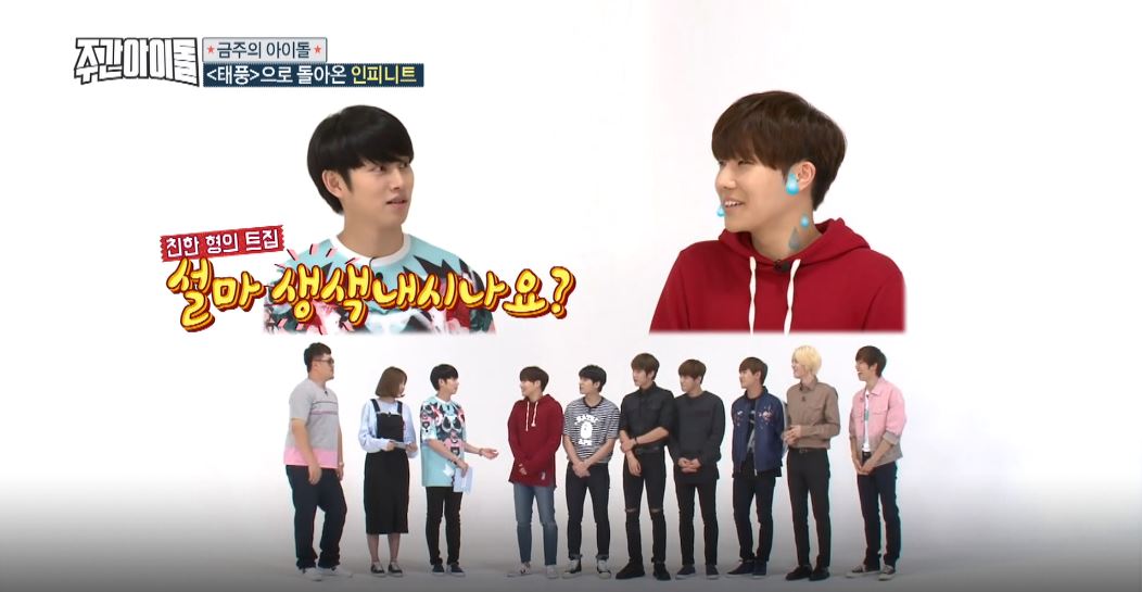 21일 방송된 MBC 에브리원 예능프로그램 <주간아이돌> 269회에서는 신곡 ‘태풍’으로 돌아온 인피니트(성규, 동우, 우현, 호야, 성열, 엘, 성종)가 ‘금주의 아이돌’ 게스트로 출연해 출중한 예능감을 뽐냈다.