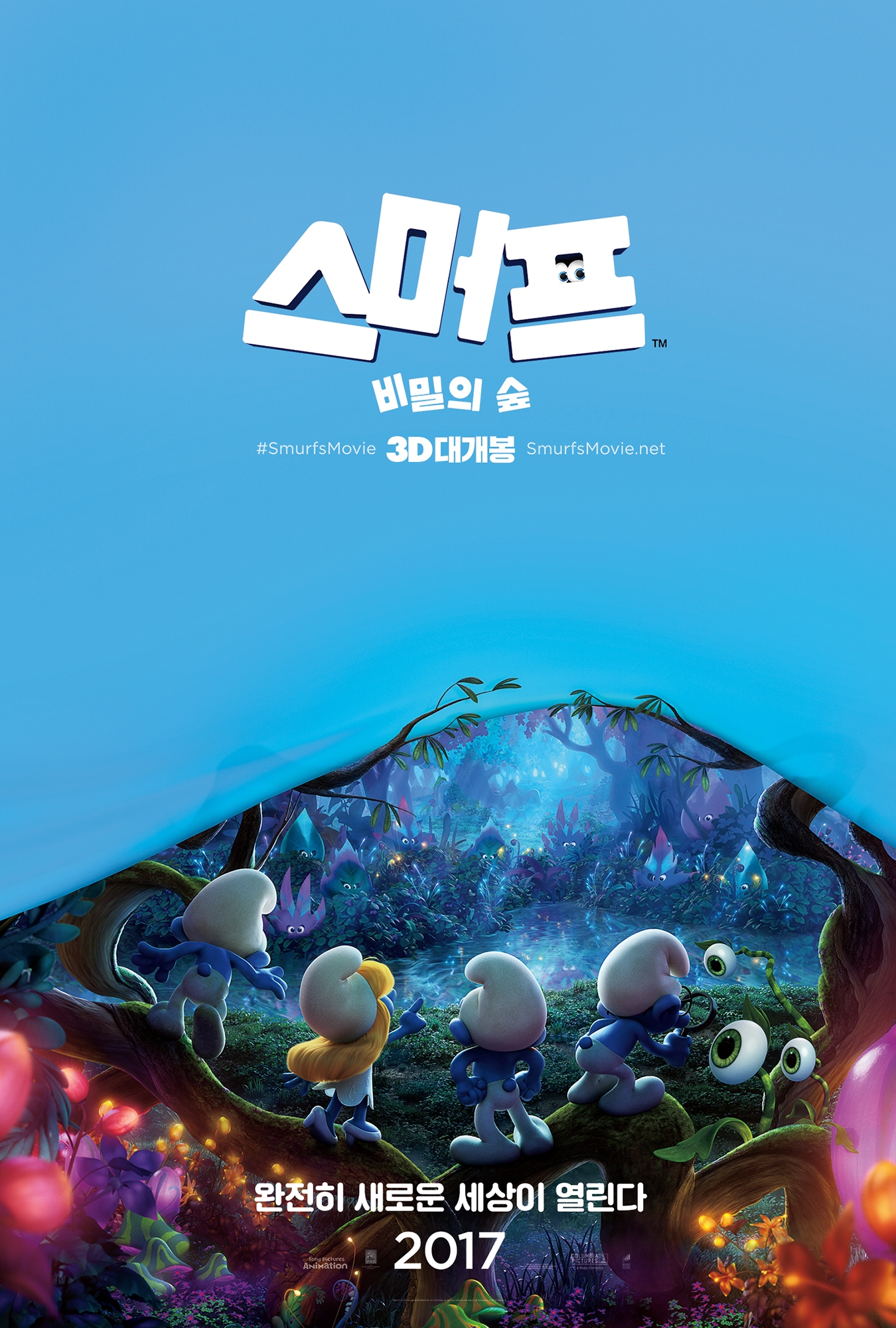 시리즈 사상 가장 오리지널 스머프의 비주얼을 완벽하게 재현한 <스머프: 비밀의 숲>이 2017년 완전히 새롭고 더욱 귀여운 모습으로 돌아온다. 이전 시리즈들이 애니메이션과 실사가 합해진 하이브리드 영화였던 반면, 이번 <스머프: 비밀의 숲>은 가장 오리지널 스머프들의 모습을 100% 애니메이션만으로 구현하여, 더욱 폭넓은 관객들에게 다가갈 예정이다. 이번에 공개된 티저 포스터는 밝고 유쾌한 스머프 마을과는 상반된 미스터리한 분위기의 비밀의 숲 비주얼로 시선을 사로잡는다. 반쯤 가려진 파란 커튼과 여기에 “완전히 새로운 세상이 열린다”라는 카피가 더해져, 신비로운 빛과 환상적인 색감으로 가득 찬 비밀의 숲에 들어온 스머프들에게 앞으로 어떤 세상과 새로운 모험이 펼쳐질지 궁금증을 증폭시킨다.