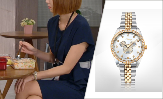 이 장면에서 주예은은 모던한 포인트가 들어간 네이비 톤 원피스를 매치한 한편, 실버 바탕에 골드 프레임과 큐빅 장식이 포인트를 더한 손목 시계를 매치해 심플하면서도 세련된 커리어우먼의 느낌을 연출했다.