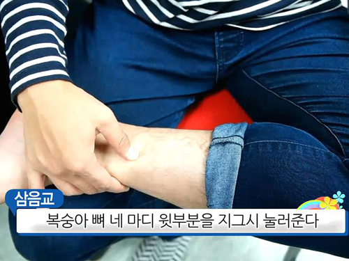 삼음교는 복숭아 뼈 네 마디 윗부분에 있는데 그곳을 지긋이 눌러 지압한다.