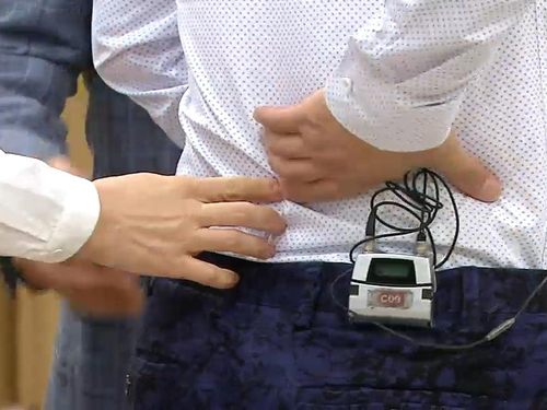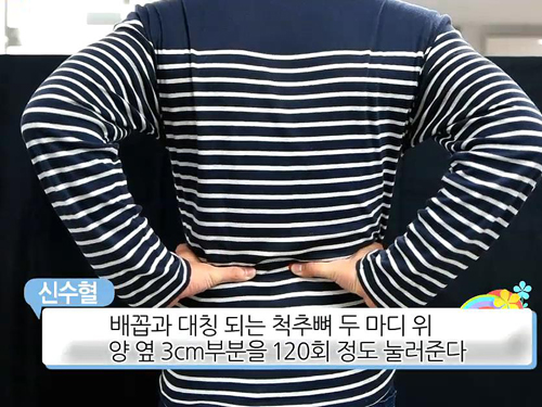배꼽과 대칭 되는 척추 뼈 두 마디 위 양 옆 3cm부분을 120회 정도 눌러 준다.