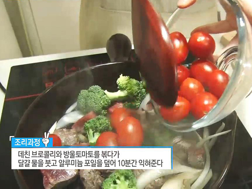 살짝 데친 브로콜리와 방울토마토를 같이 넣고 볶다가 달걀 풀은 물을 붓고