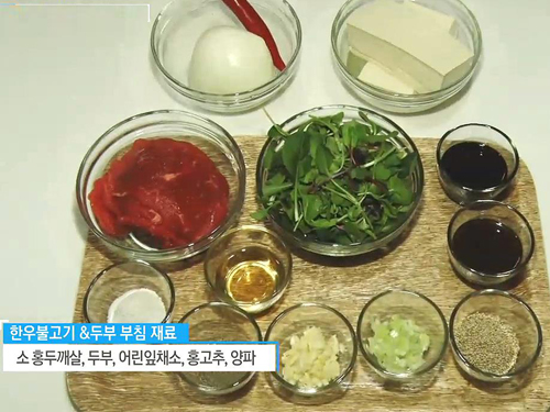 한우불고기와 두부 부침은 소 홍두깨살, 두부, 어린잎채소, 홍고추, 양파를 준비한다.