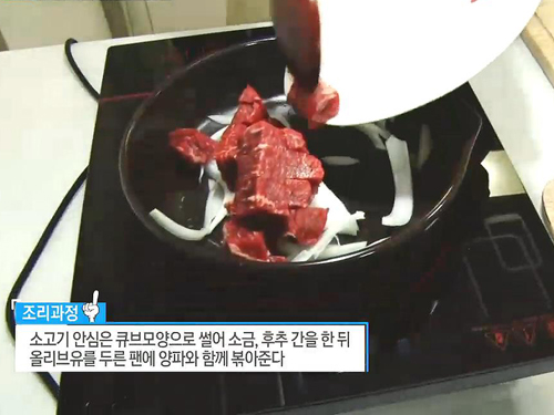 안심은 큐브모양으로 썰어 소금, 후추 간을 한 뒤