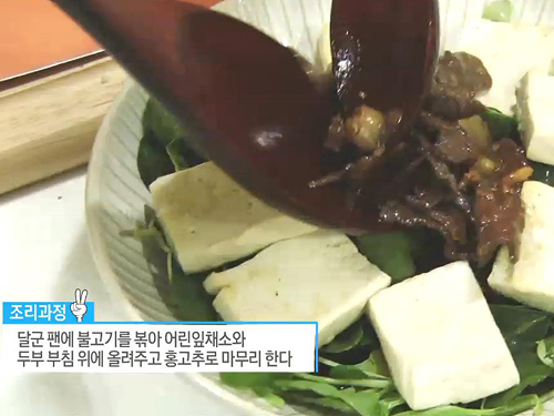 달군 팬에 불고기를 볶아준 뒤 어린잎채소와 두부 부침 위에