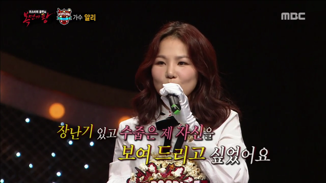 이어 '팝콘소녀'가 가면을 벗고 정체를 공개했다. 그녀는 데뷔 8년차 가수 알리였다. 그녀는 "제 목소리만 들으면 강하고 차갑다고 생각하시지만 평소의 저는 장난기 있고 수줍음을 많이 탄다. 그런 제 모습도 보여드리고 싶었다"는 출연 계기를 밝혔다.