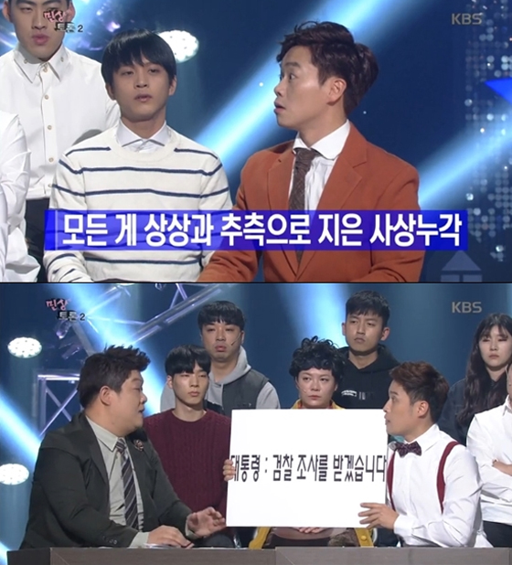 27일(일) 방송된 KBS 2TV <개그콘서트>의 인기 코너 ‘민상토론2’가 올해 최고의 코미디로 국정논단 사태를 꼽으며 3주째 날선 비판을 이어가 시청자들의 눈길을 모았다.