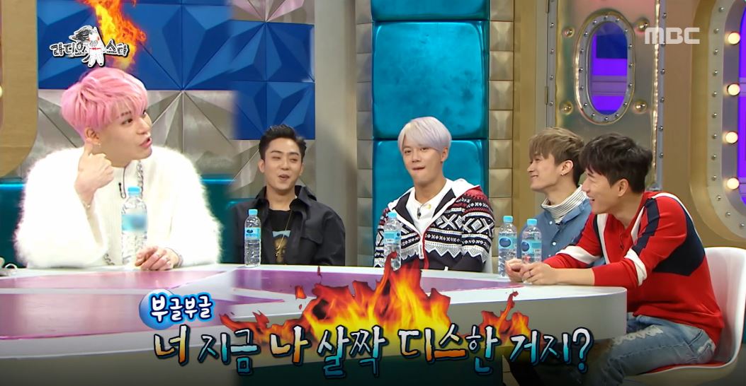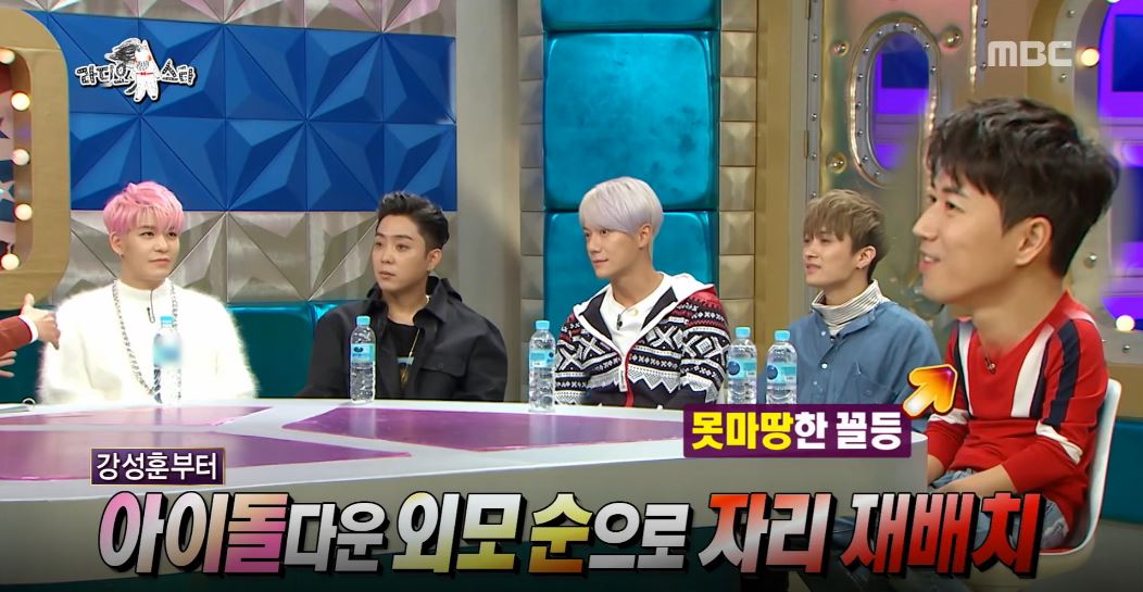 먼저 김국진이 “5개월 전 출연했을 때와 앉은 자리가 다르다. 아이돌다운 외모순으로 재배치했다”라고 밝혔다. 이에 끝자리에 앉아있던 장수원이 “재미없는 순 아닌가?”라며 못마땅한 모습을 보였다.