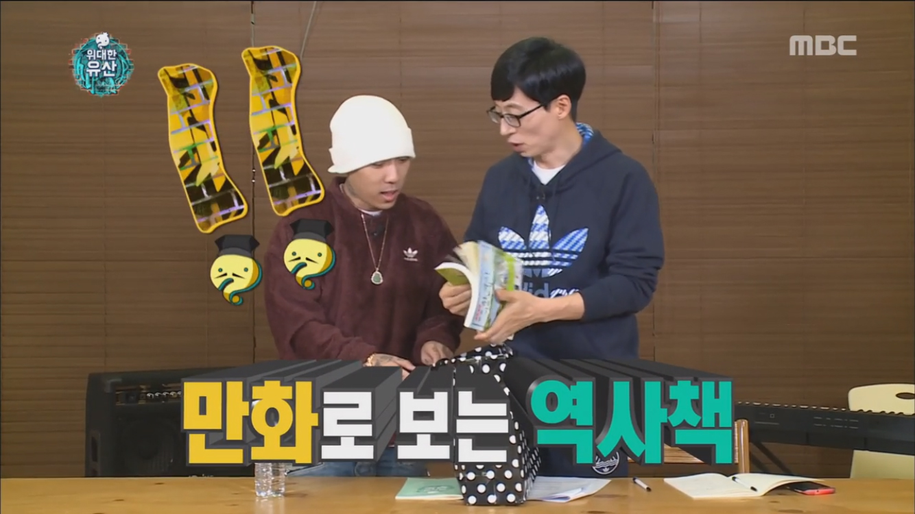 이어 유재석도 도끼를 위해 준비한 만화 역사책을 전달했다. “처음부터 글로 공부하면 힘들 수 있다”며 쉽게 공부하라는 유재석의 배려였다. 도끼는 “되게 많다”며 다소 시무룩해하면서도 유재석의 배려에 고마워했다.