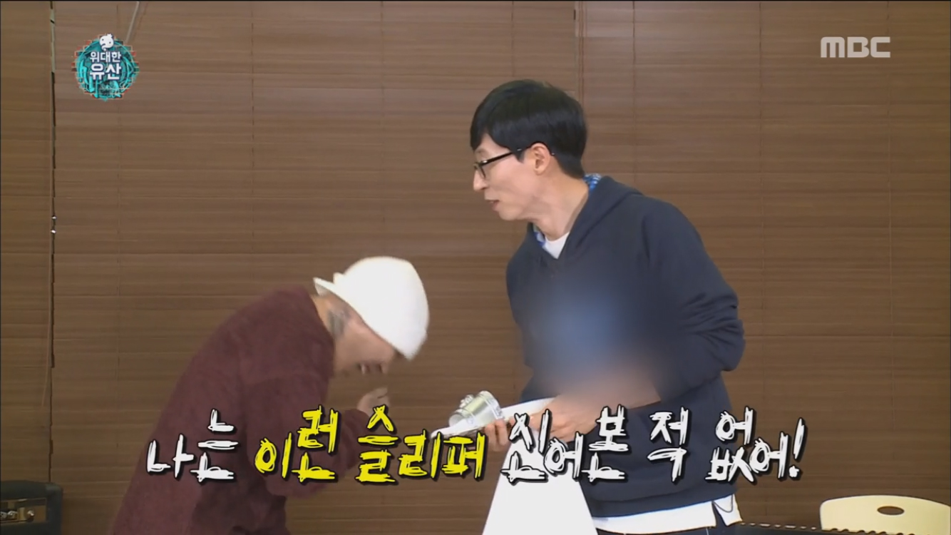 선물은 바로 화려한 은장식의 슬리퍼였다. “내가 슬리퍼 좋아하는 거 아시지 않냐. 집에서 신어라”고 말하는 도끼에 유재석은 “나는 이런 슬리퍼를 신어본 적이 없다”며 당황한 듯 웃었다.