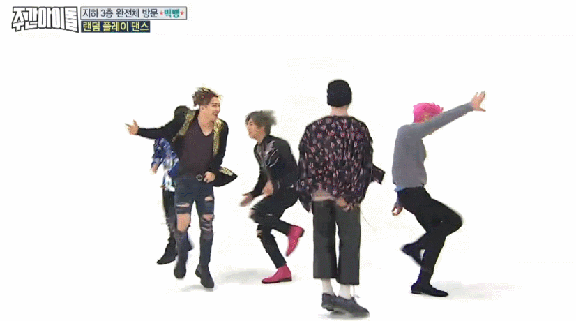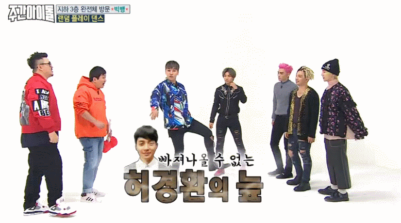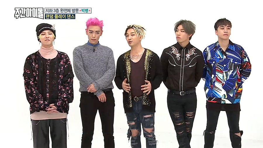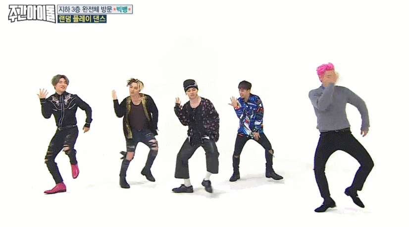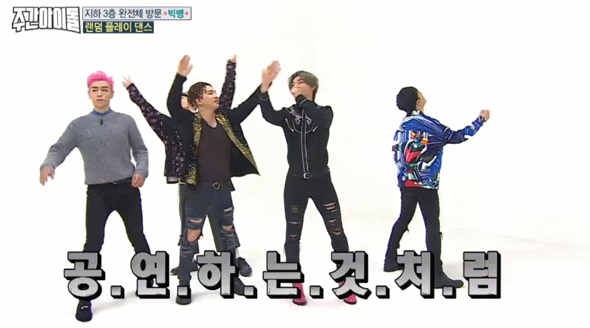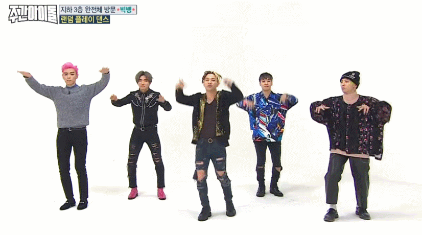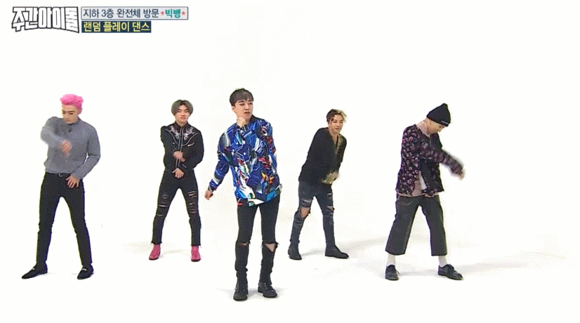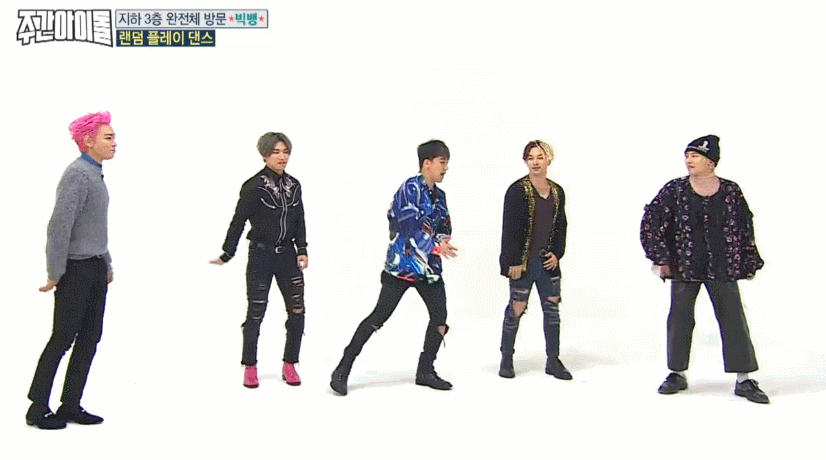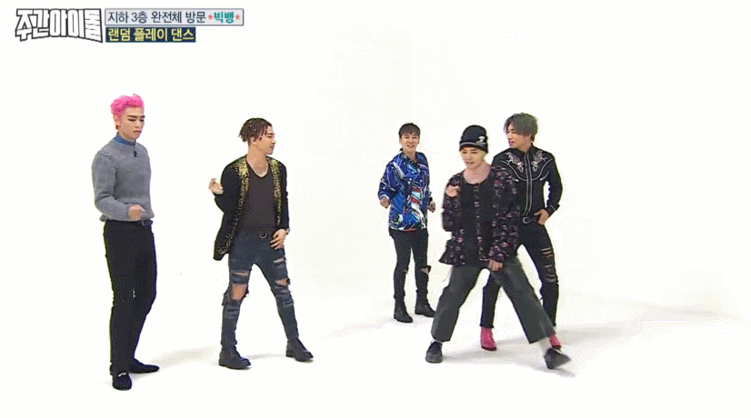 4일(수) <주간아이돌>에는 타임지가 선정한 K-POP스타 1위에 빛나는 '빅뱅'이 완전체로 출연하며 화제를 모았다. 지드래곤이 솔로앨범 당시 꼭 빅뱅 완전체로 함께하겠다는 약속이 지켜지는 순간. 도니코니(MC 정형돈, MC 데프콘)은 "혹시 주간아이돌의 마지막 방송은 아니냐?"며 농담을 던질 만큼 엄청난 그들이 1시간을 함께했다. VIP(빅뱅 팬클럽 이름)들이 직접 뽑은 가장 나왔으면 좋겠다는 방송 1위답게 <주간아이돌>에서 농도짙은 게임과 랜덤 플레이 댄스까지, 예능감 빵빵 터졌다는 그들. 특히 최초로 공개되는 빅뱅표 랜덤 플레이 댄스는 뿅망치 소리가 그치지 않았다고. 그 현장을 움짤로 만나보자.