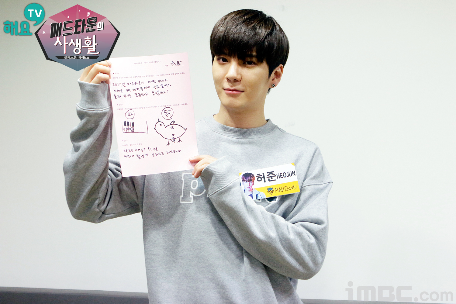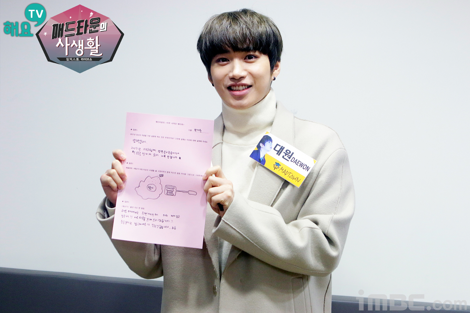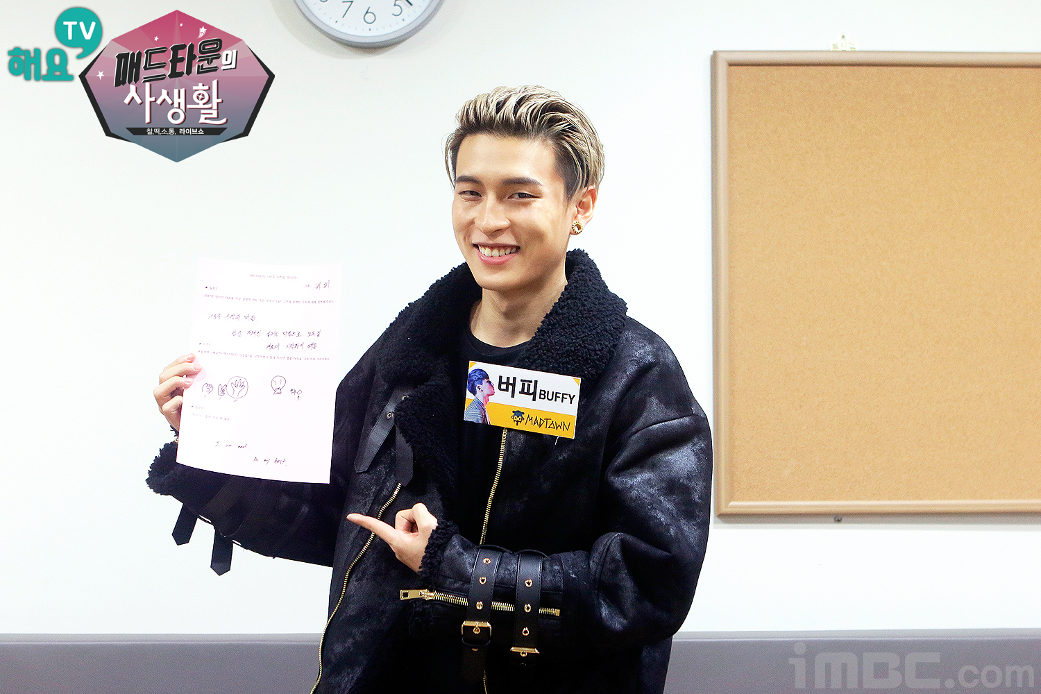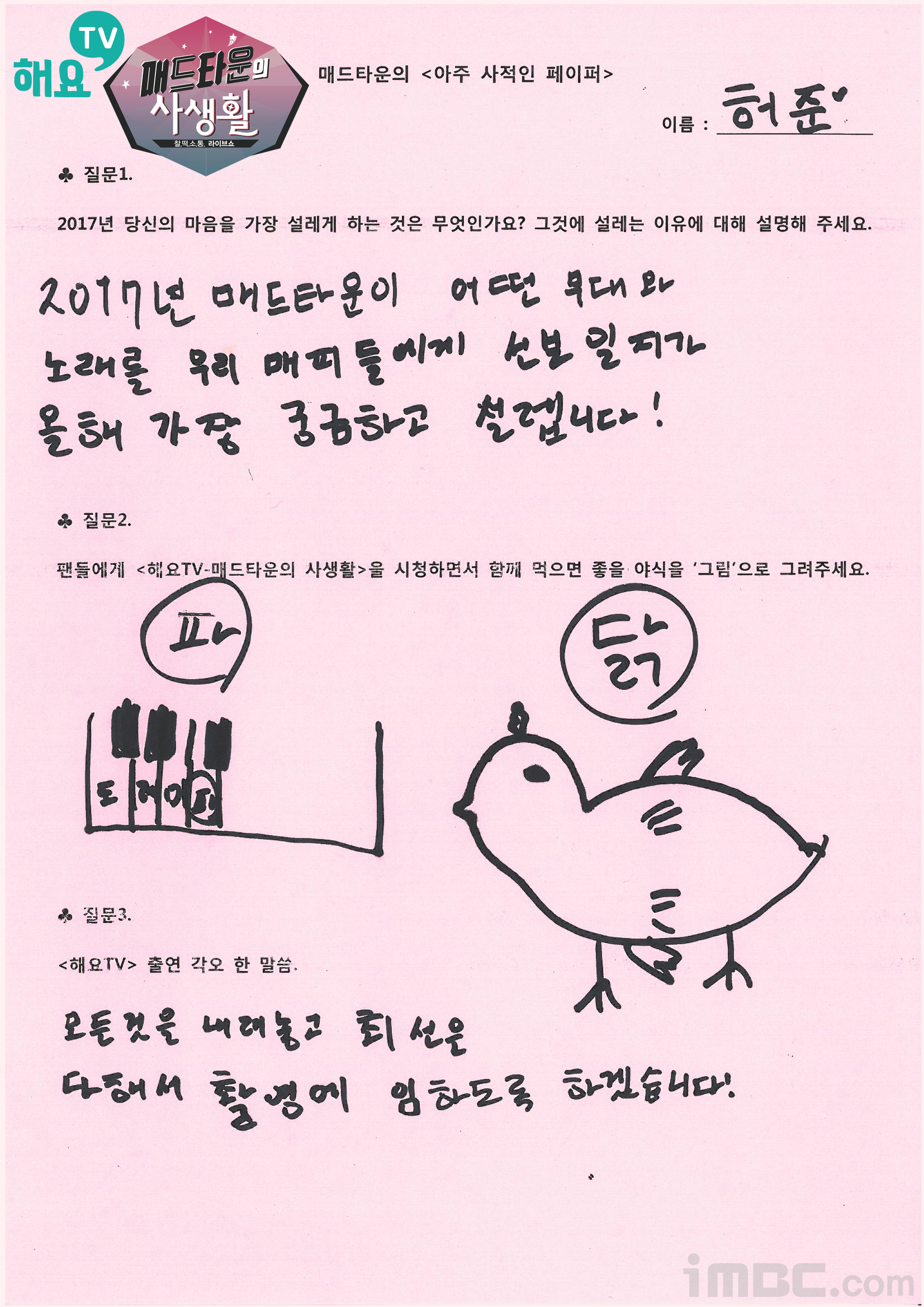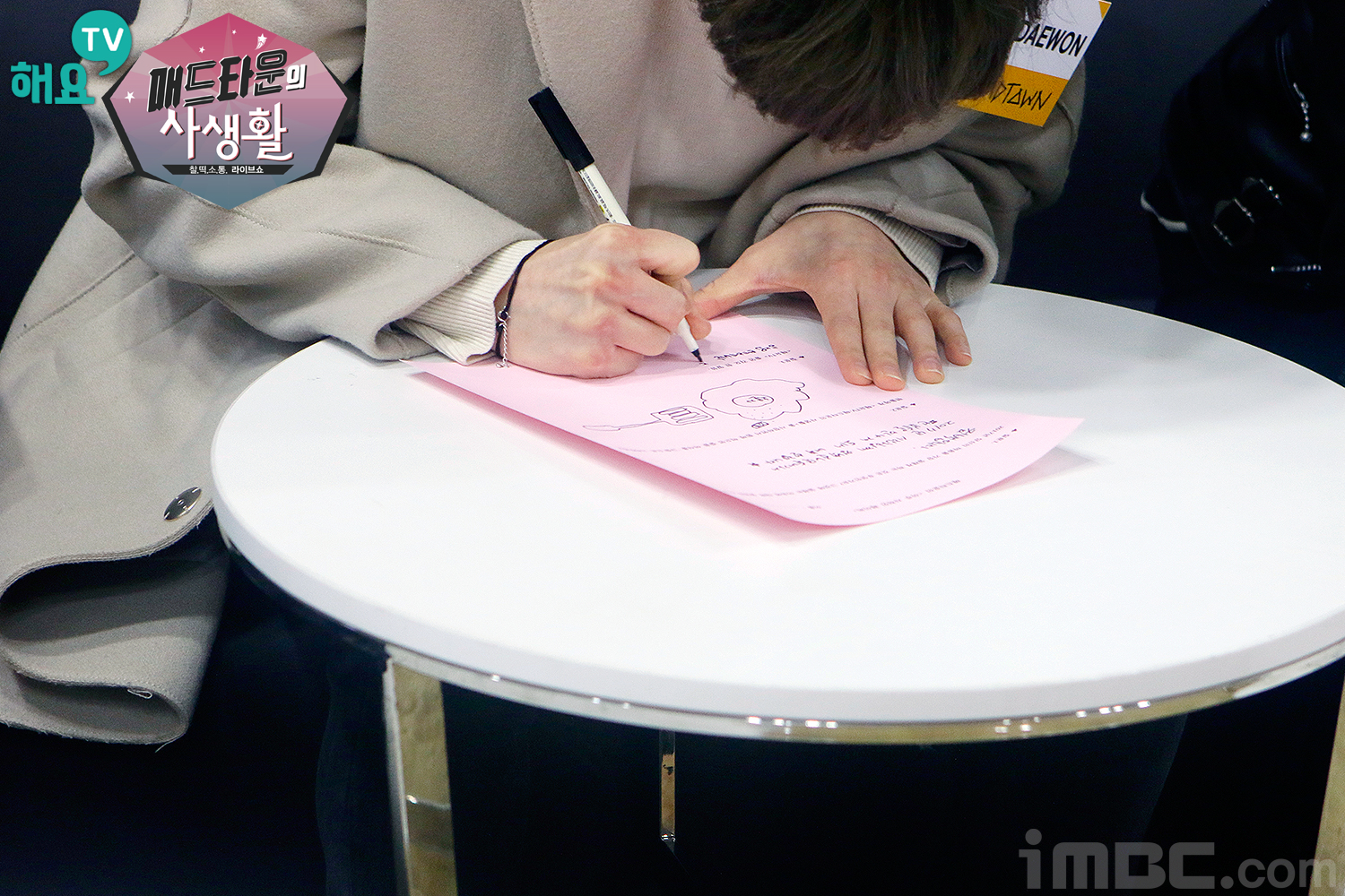 4일(수) 밤 9시 <해요TV>에서는 대세 아이돌 '매드타운'이 출연해 팬들과 실시간 채팅으로 소통하며 생방송으로 진행되는 <매드타운의 사생활>이 방송됐다. 이날 방송에 앞서 iMBC는 매드타운 멤버들을 대기실에서 만나 몇 가지 질문이 담긴 '사적인 페이퍼'를 전달, 그들의 깜찍한 손글씨와 그림실력을 엿보았다.
