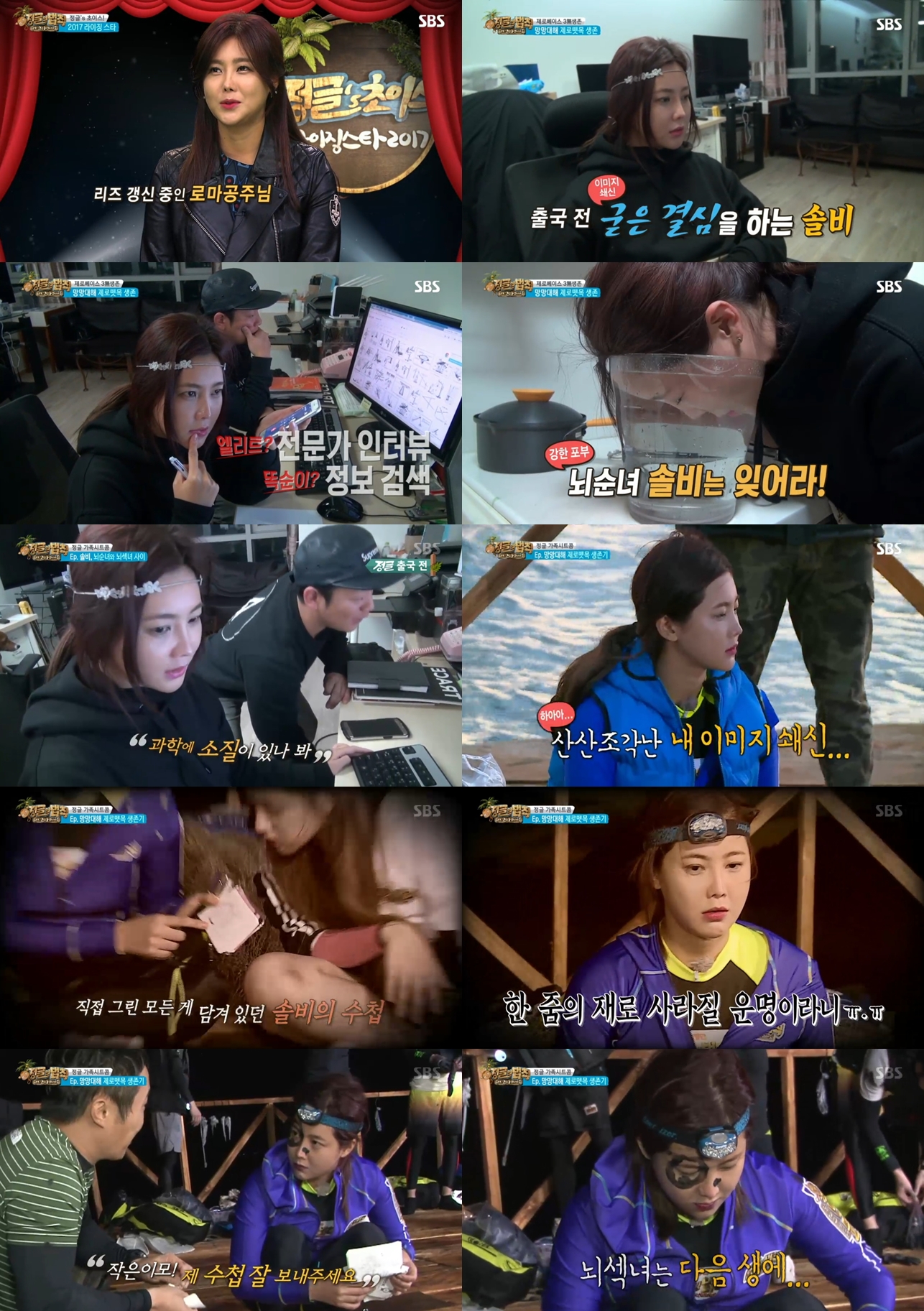 똑순이 뇌섹녀로 거듭나기 위한 솔비의 계획은 여기에서 멈추지 않았다. 껌종이와 건전지를 이용해 불을 피우는 방법을 검색해 연습까지 해본 솔비는 “알고 보니 에디슨 이쪽인가. 과학에 소질 있나봐”라며 자신감을 보였지만, 강한 바람과 높은 습도로 실패해 아쉬움을 자아냈다. 결국 솔비의 준비 수첩은 불을 피우던 김병만에 의해 한 줌 재로 돌아가며 웃음을 자아냈다.