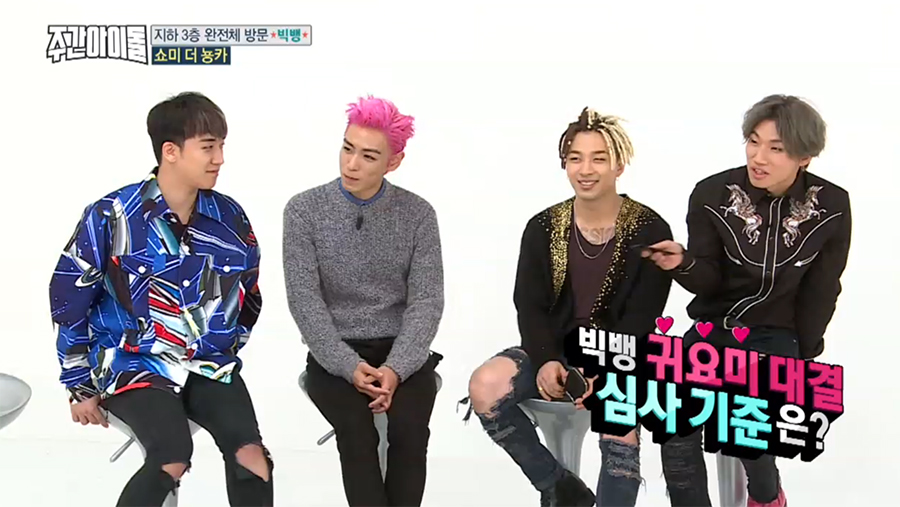 11일(수) <주간아이돌>에는 '빅뱅'이 완전체로 출연한 지난 1화에 이어 빅뱅 특집 2화가 방송되며 화제를 모았다. 특히 이번 <주간아이돌>에서는 평소 만나볼 수 없던 빅뱅의 걸그룹 댄스부터 애교까지... VIP(빅뱅 팬클럽 이름)의 소장을 부르는 1시간을 만들었다. 10년이라는 긴 시간동안 함께한 멤버들의 색다른 모습에 놀란 멤버들, 그리고 그걸 지켜보는 MC 도니코니(정형돈, 데프콘). 특히 상품 앞에 무너진 애교퍼레이드는 많은 시청자들의 마음을 사로잡았다고, 그 명장면을 생동감 넘치는 움짤로 만나보자.
