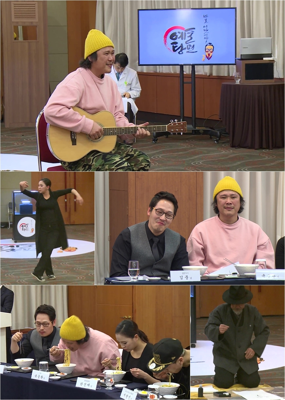 무엇보다 공개된 사진에는 춤을 추는 현대무용가와 머리카락으로 글씨를 쓰는 서예가의 모습이 담겨있어 무슨 상황인지 궁금하게 한다. 이 장면은 예술가들이 면발의 쫄깃함과 국물의 풍미를 예술적으로 표현하고 있는 것인데, 육중완은 이들의 진지함에 새어 나오는 웃음을 참으려 콧구멍을 벌렁거렸다고.