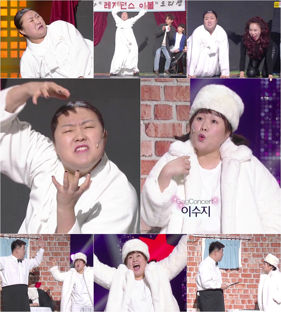 12일(일) 방송된 KBS 2TV <개그콘서트>에서 이수지는 ‘세.젤.예’와 ‘연기돌’에 출연하며 백곰녀와 연기의 달인 김정자로 분해 180도 다른 웃음을 선사했다.