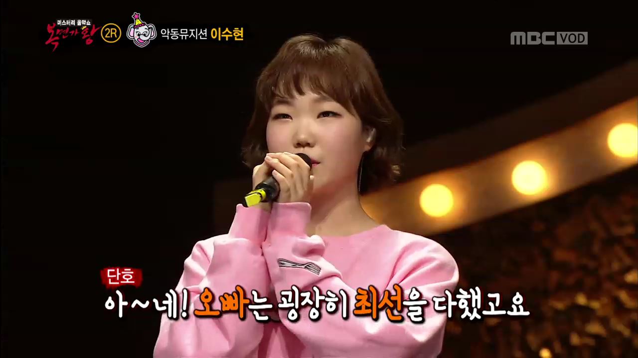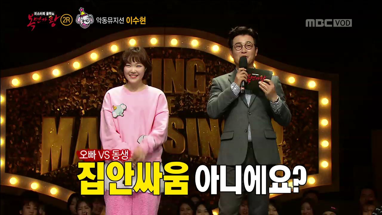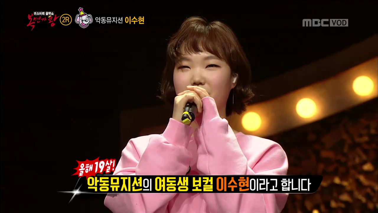 ‘코끼리 아가씨는 코가 손이래’의 정체는 악동뮤지션 이수현이었다. 2월 26일 방송된 MBC 예능프로그램 <일밤-복면가왕>에서 이수현이 악동뮤지션 남매 대결에서 이긴 소감을 밝혔다.