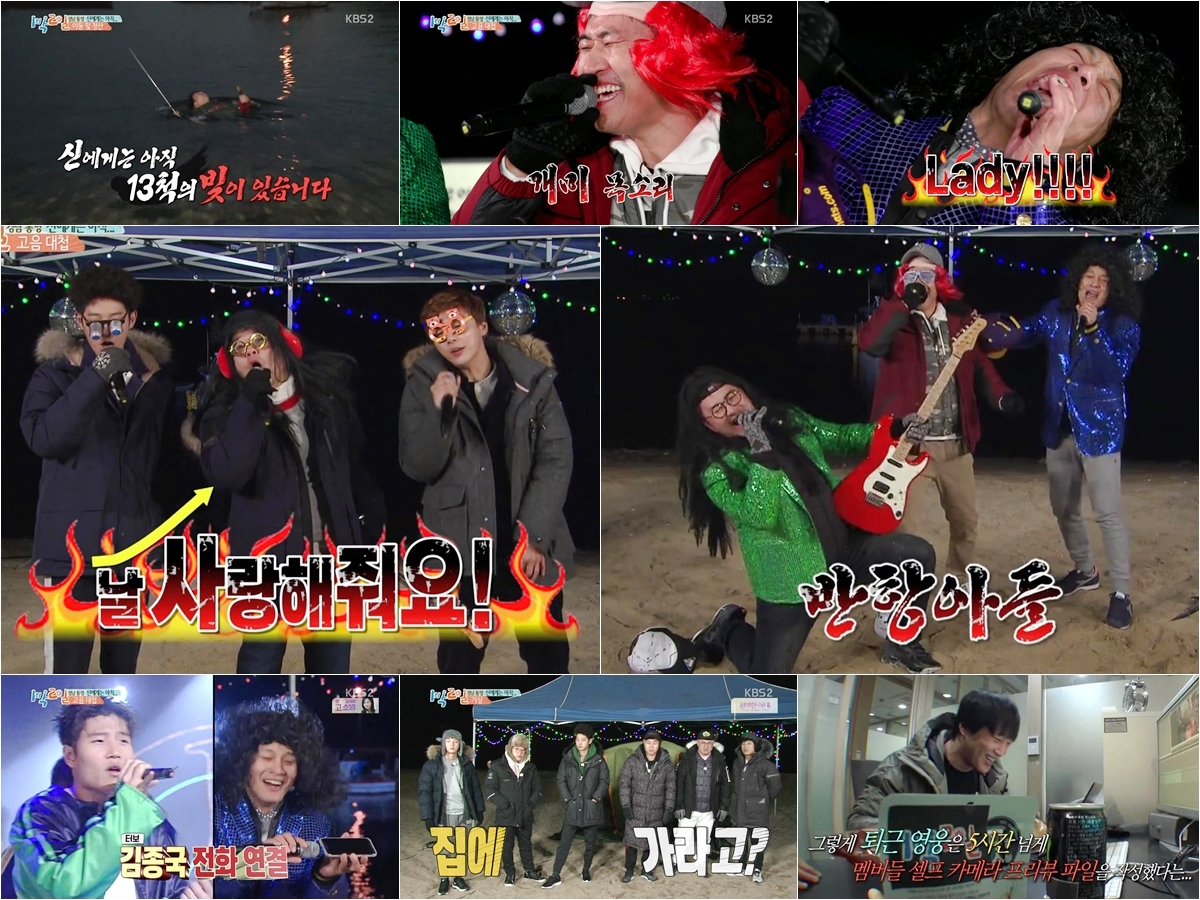 특히 김종민은 임재범-박정현의 ‘사랑보다 깊은 상처’를 부르며 소리를 먹는 색다른 개미 창법을 보여줘 시청자들을 배꼽 쥐게 만들었다. 뿐만 아니라 촬영 종료 후에도 흥을 주체하지 못해 노래를 부르고 춤을 추는 멤버들의 모습은 웃음을 선사하기에 충분했다.