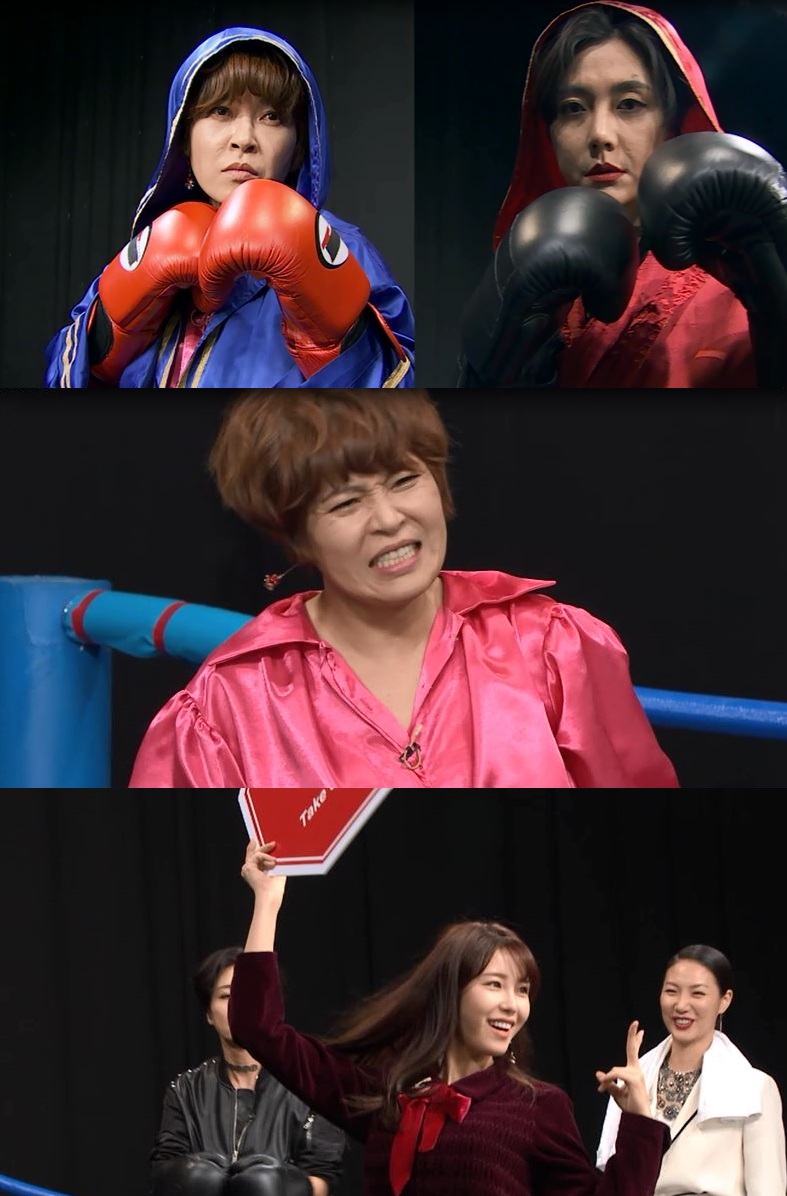이날 녹화에서 춘자와 조혜련은 <비디오스타>에서 직접 준비한 링 위에서 맞대결을 펼쳤다. MC인 전효성과 박소현은 라운드걸로 변신해 분위기를 달궜다는 후문.