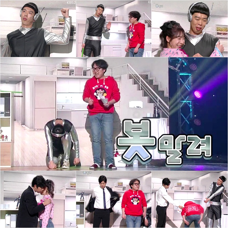 12일(일) 밤 방송된 KBS 2TV <개그콘서트>의 ‘봇말려’에서는 미래형 인공 지능 로봇들과 인간 홍현호의 신경전이 코믹하게 그려졌다. “쓸데없는 감정은 일처리에 걸림돌일 뿐”이라며 심장이 없음을 강조하는 ‘진호봇’ 박진호는 주인인 홍현호의 말 하나하나에 상처받고 토라지며 큰 웃음을 선사했다.