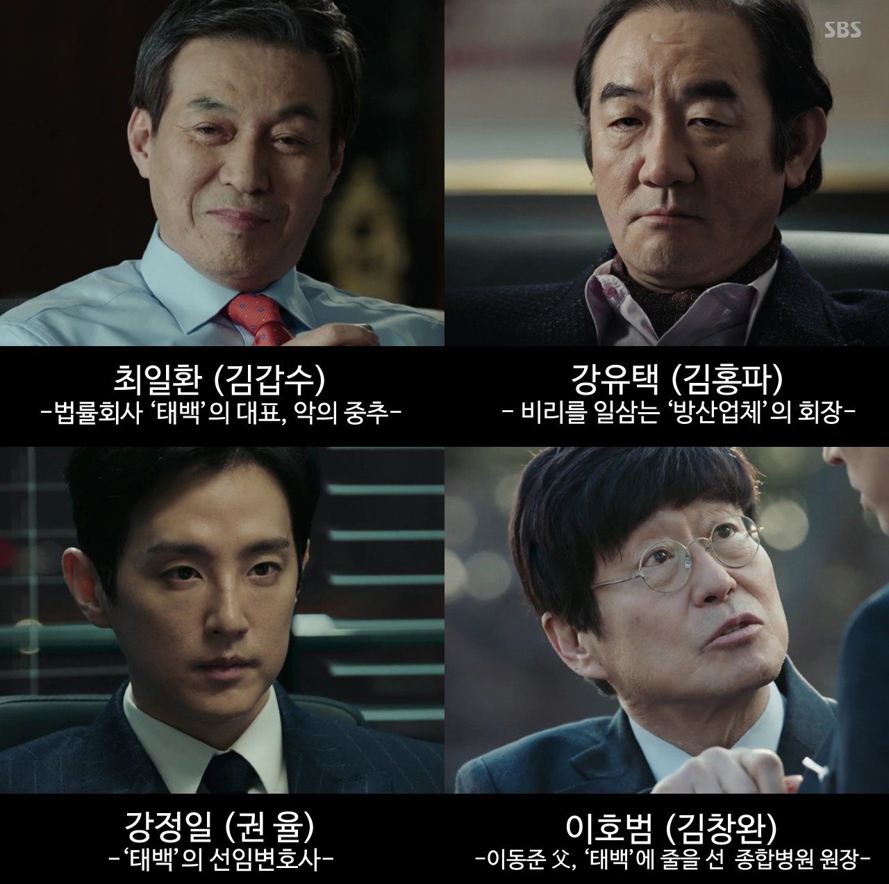 이밖에 백상구(김뢰하 분)는 강정일의 지저분한 뒷처리를 돕는 조폭이다. 강정일의 지시로 방산 비리를 취재하던 기자를 청부살인한 악인이다. ‘태백’의 변호사 조경호(조달환 분)는 친구인 강정일을 돕다가 불법에 발을 담그면서 그 늪에 더욱 빠지는 속물이다.
