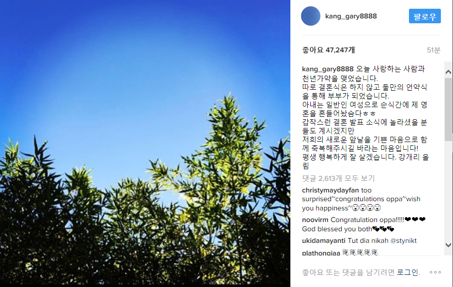 개리는 5일 자신의 인스타그램에 "오늘 사랑하는 사람과 천년가약을 맺었습니다"라 깜짝 결혼 소식을 전했다.