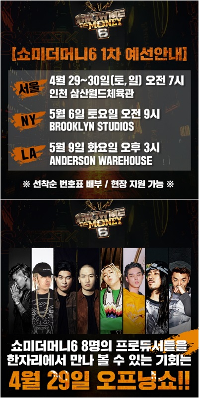 또한, 이번 <쇼미더머니6> 미국 예선은 LA와 더불어 시즌 최초로 뉴욕에서도 진행된다. 방식은 한국 예선과 같으며 현지 시각으로 5월 6일(토)에 뉴욕 BROOKLYN STUDIOS, 9일(화)에 LA ANDERSON WAREHOUSE 에서 치러질 예정이다.