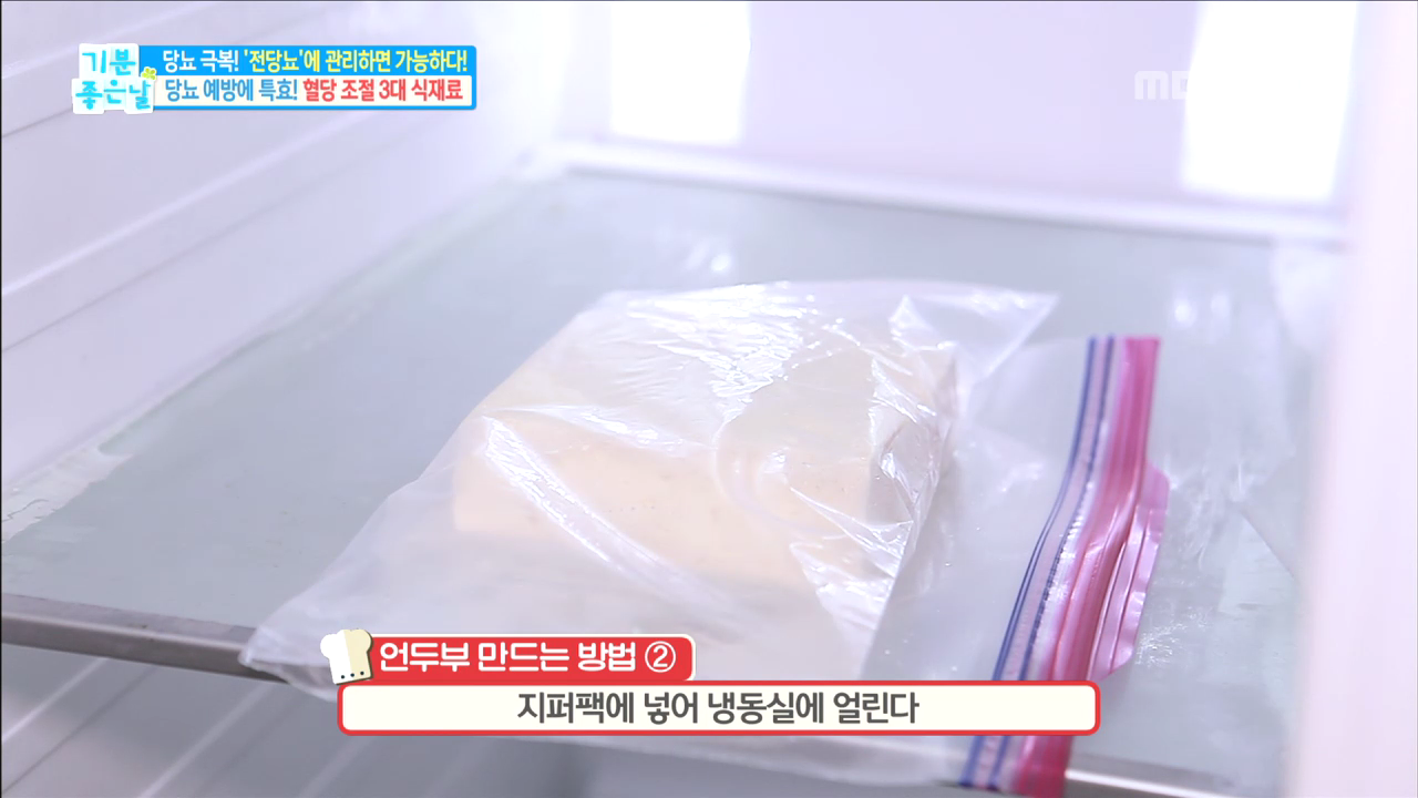 1. 두부의 수분을 제거한 후 지퍼팩에 넣어 냉동실에 얼린다.