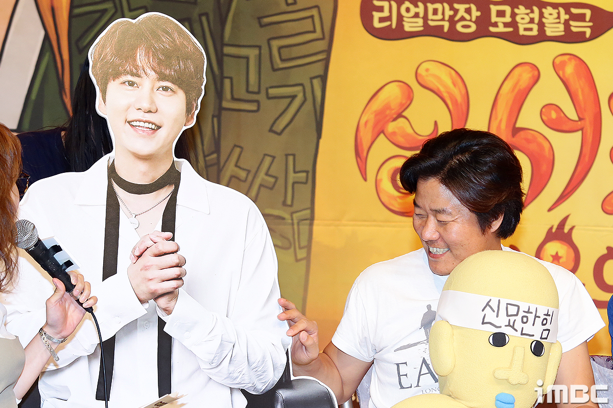 제작발표회에 참여한 나영석 PD가 규현의 판넬을 보고 웃음이 터진 모습이다.
