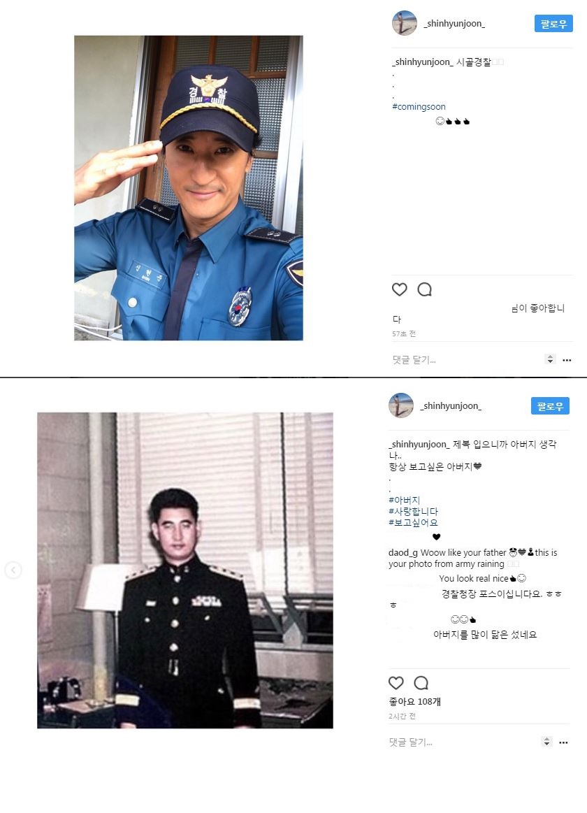 또한 경찰 제복을 입은 신현준의 사진과 함께 과거 군인이던 신현준의 아버지의 모습이 같이 게재되어 더욱 눈길을 끌었다.