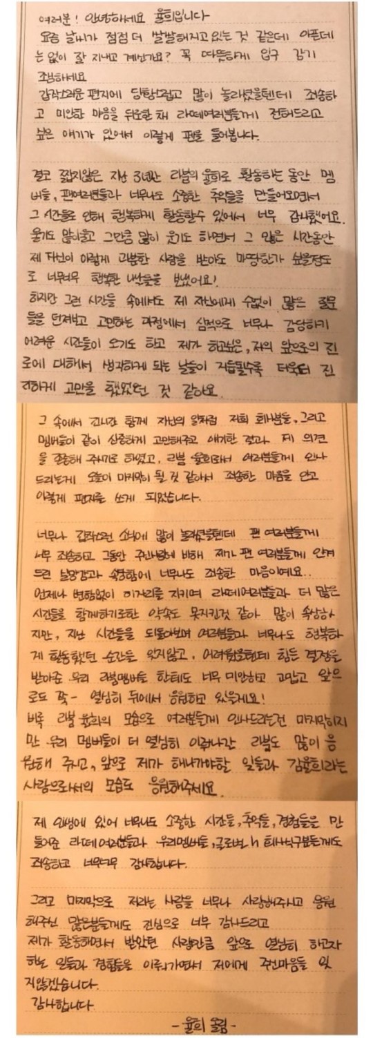 율희는 라붐을 뒤에서 응원하겠다는 말과 함께 멤버들, 팬들, 회사에 감사 인사를 전했다. 마지막으로 율희는 "저라는 사람을 너무나 사랑해주시고 응원해주신 많은 분들께도 진심으로 너무 감사드리고 잊지 않을 것"이라는 말로 편지를 마무리했다.