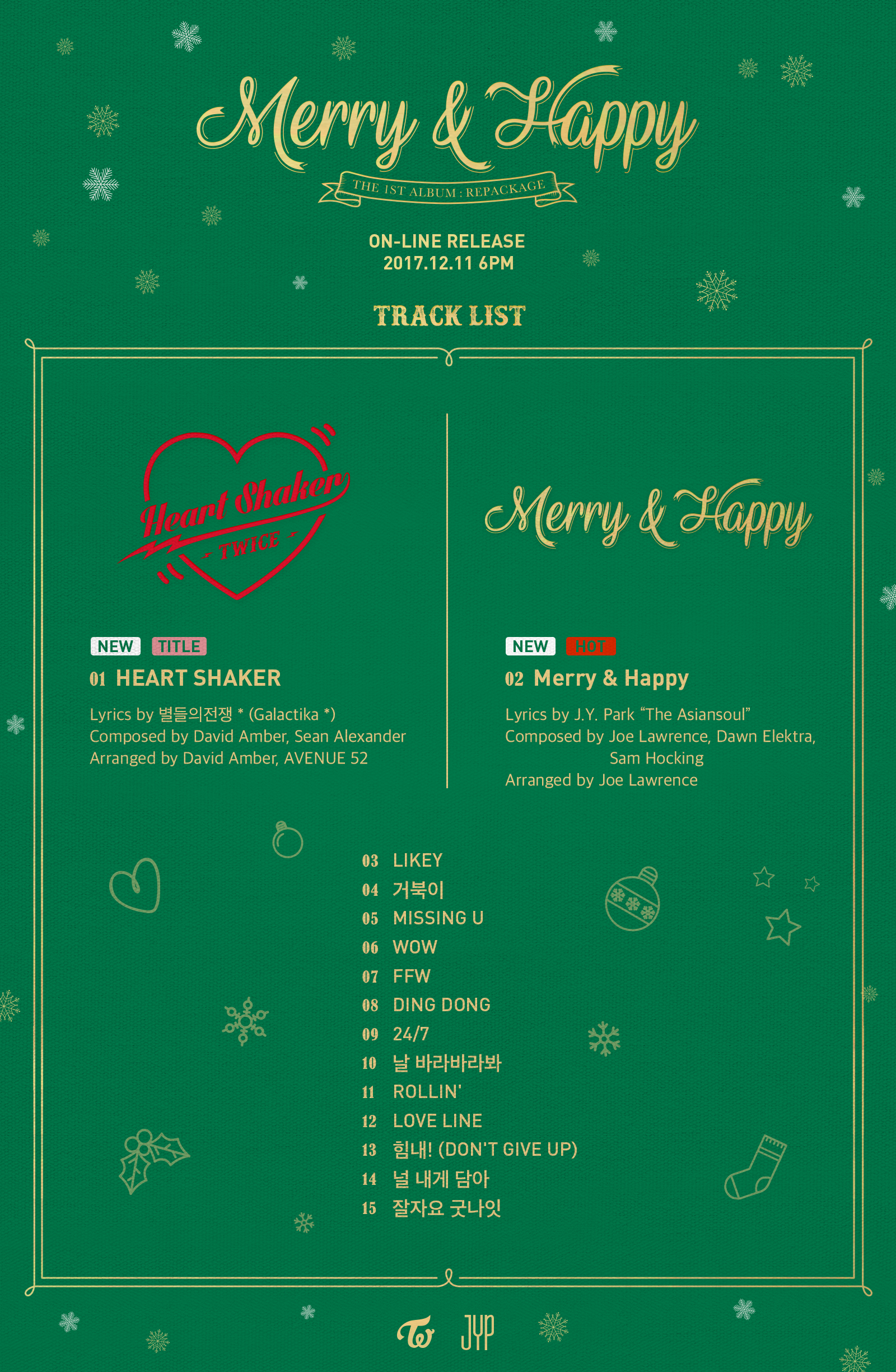 해당 트랙리스트는 총 15트랙의 곡 정보와 함께 신곡 2곡의 크레딧을 공개해 시선을 끌었다. 트와이스는 타이틀곡 하트셰이커(Heart Shaker)' 외에 앨범명과 동명의 신곡 '메리 & 해피'를 공개하는데, 해당 곡은 크리스마스 시즌을 겨냥해 트와이스가 선보이는 캐롤로 특히 JYP 수장 박진영이 작사한 것으로 밝혀져 눈길을 모은다.