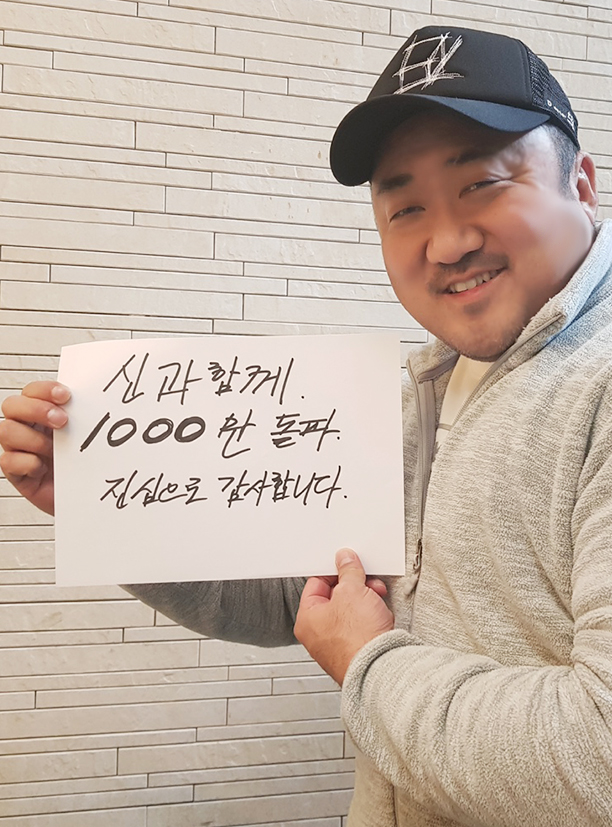 흥행 神들이 진정한 천만 귀인들에게 전하는 진심을 담은 인사도 눈길을 끈다. <신과함께-죄와 벌>의 배우들은 영화를 봐준 천만관객들에게 친필 메시지로 감사의 인사를 전했다. 김향기는 잠옷을 입은 채 귀여운 모습으로, 도경수는 또박또박 눌러쓴 글씨에 마음을 담았다. 또한 이준혁은 직접 그린 그림으로 감사의 마음을 전했고, 이정재는 미처 촬영장의 상처 분장도 채 지우지 못한 채 인증샷을 전해왔다. 쿠키 영상에서 참을 수 없는 웃음을 선사했던 마동석도 감사 인사에 빠지지 않았다. 각자 자리에서 진심을 담은 감사를 전해온 배우들의 마음이 느껴지는 인증샷들이다.